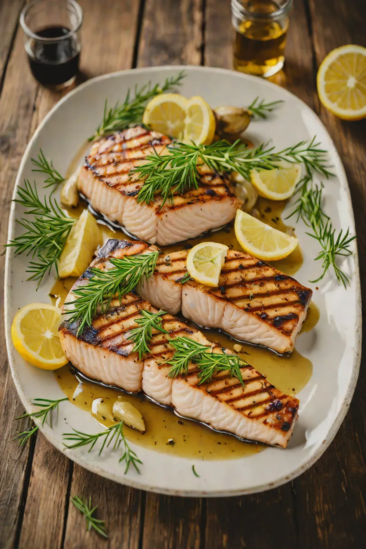 Grill swordfish steaks for 4-5 minutes per side, depending on thickness, until the flesh is opaque and flakes easily but remains moist. Arrange thyme sprigs on top during the final minute for subtle flavor infusion.