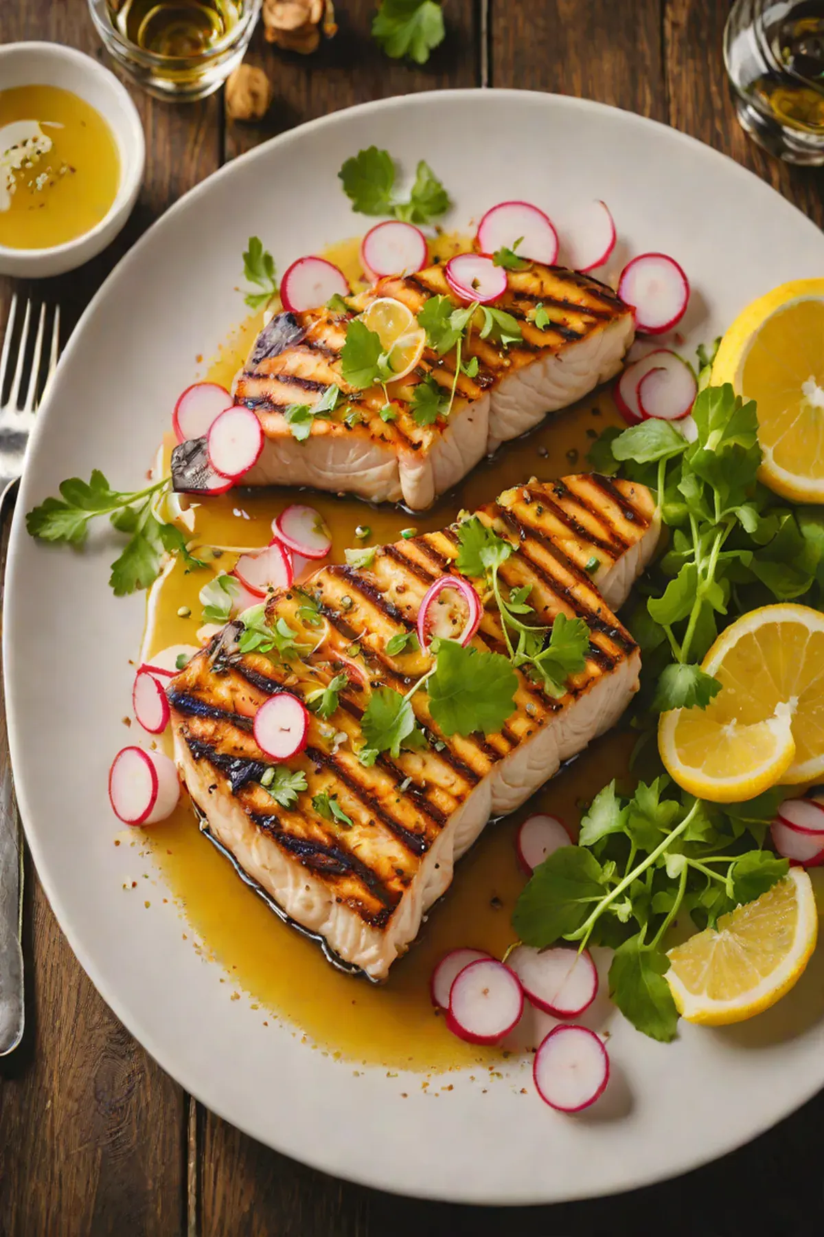 Transfer the grilled swordfish to serving plates and top each steak generously with the fresh radish slaw. Drizzle any remaining citrus glaze over the top and serve immediately.