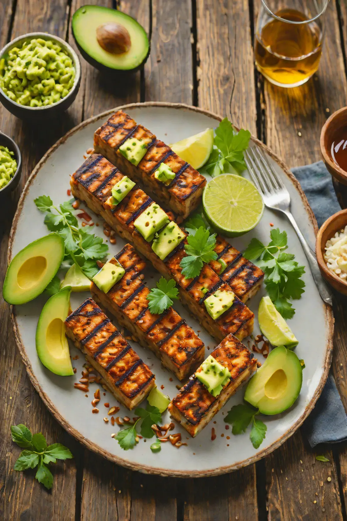 Arrange grilled tempeh on serving plates, top each slice with mashed avocado, drizzle with lime crema, and finish with cilantro-jalapeño salsa.