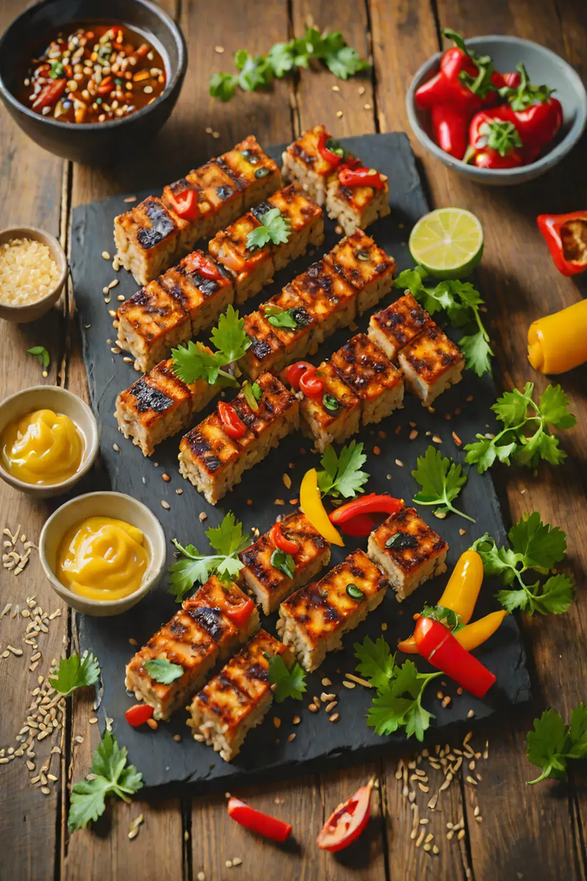 Transfer the grilled tempeh and peppers to a serving platter. Sprinkle with sesame seeds and sliced scallions. Serve immediately while still warm.