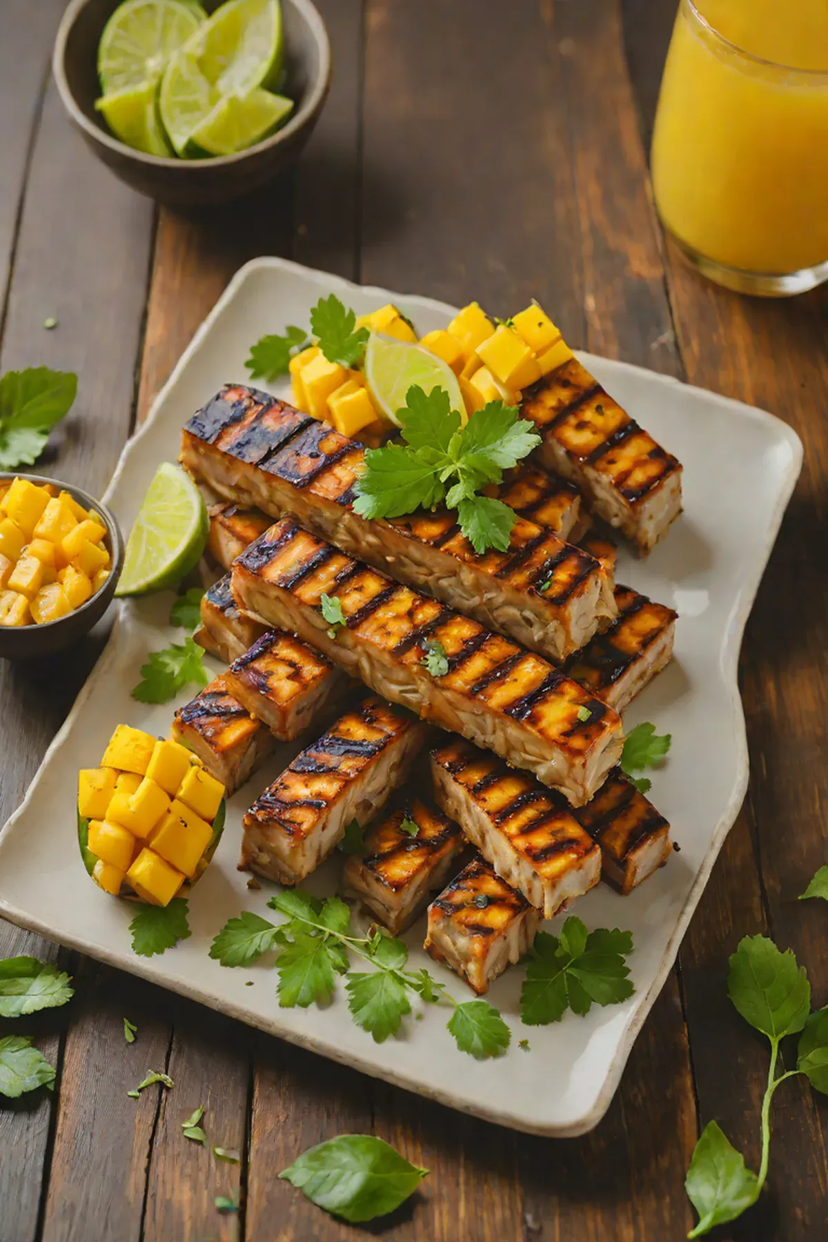 Grilled Tempeh with Cassava Root Wedges and Mango-Lime Glaze