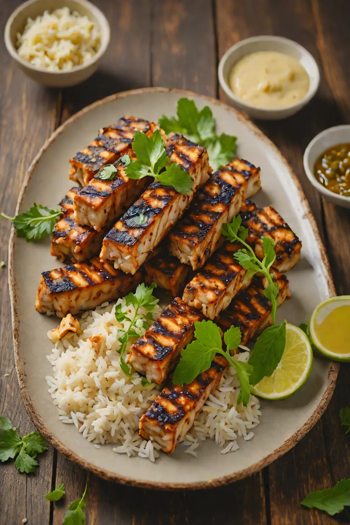 Place the tempeh steaks on the grill and cook for 5-6 minutes per side until deep grill marks form and the surface is caramelized. Transfer to a platter.