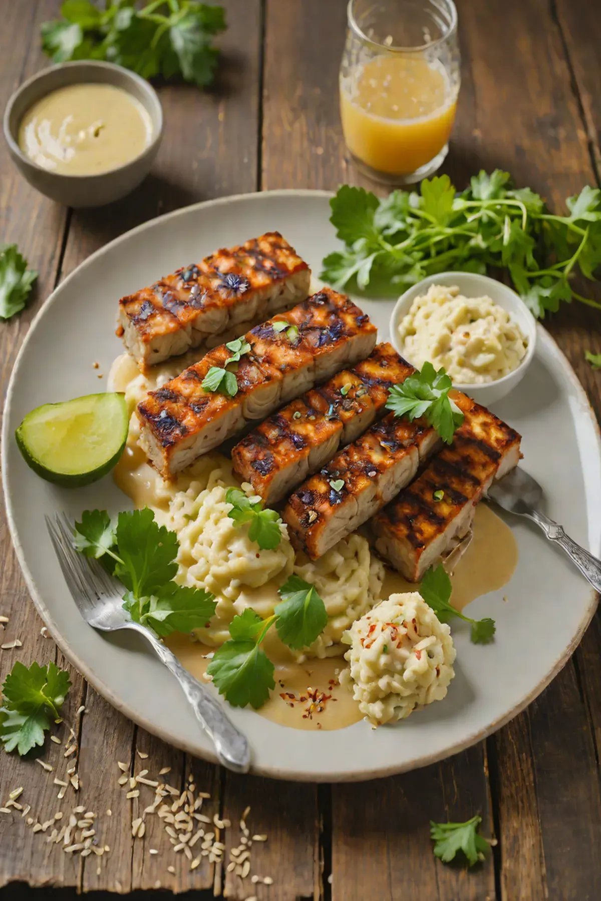To serve, spread a generous dollop of celery root puree on each plate, top with a grilled tempeh slab, and arrange charred celery pieces around it. Drizzle with any remaining marinade.