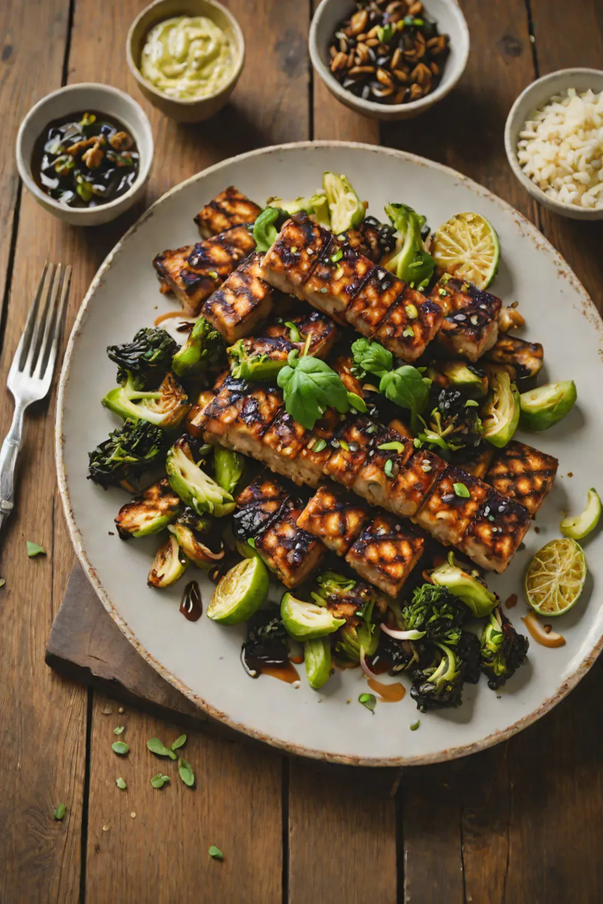 Grilled Tempeh with Charred Brussels Sprouts and Miso-Ginger Glaze