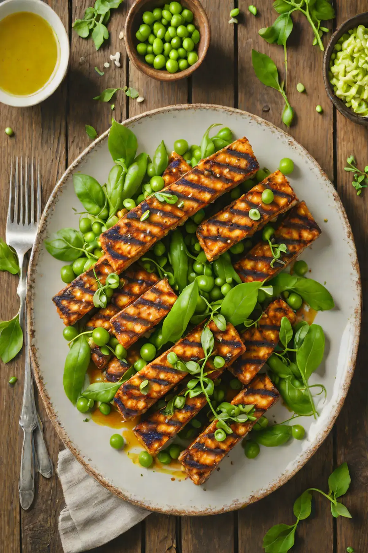 Grilled Tempeh with Spring Pea Medley