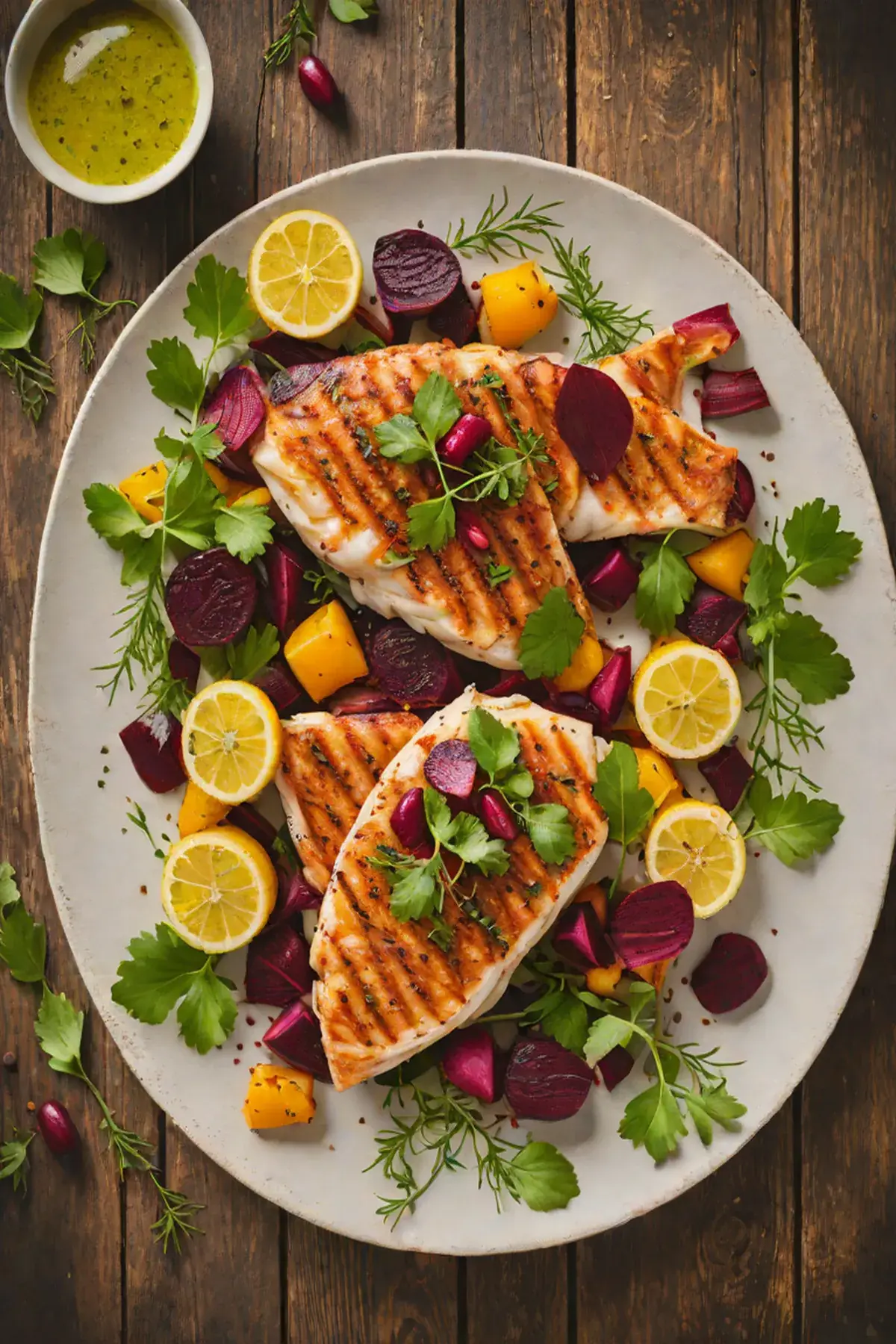 Arrange grilled beetroot wedges alongside the fish. Drizzle the beetroot with balsamic vinegar and squeeze fresh lemon juice over everything just before serving.