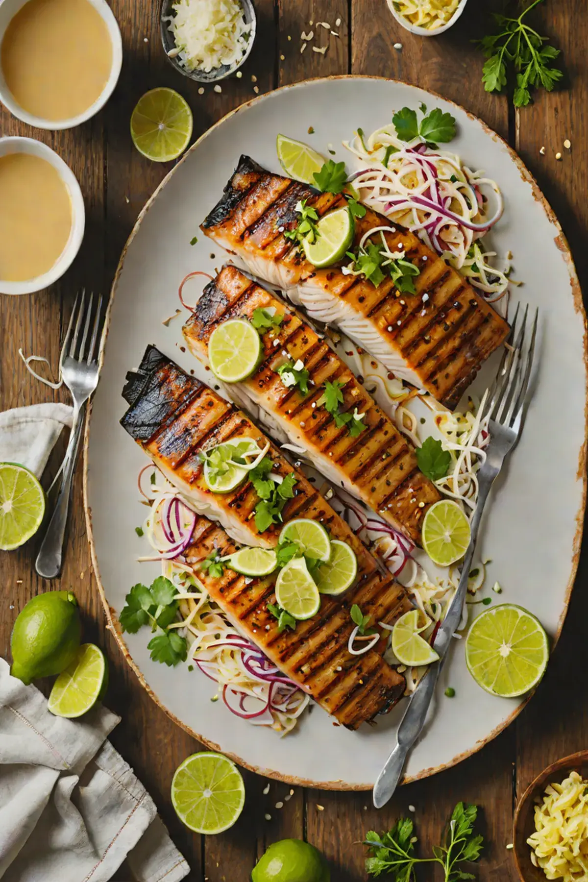 In a separate bowl, whisk together rice vinegar, minced ginger, sesame oil, and remaining lime juice to create the slaw dressing. Season with a pinch of salt.