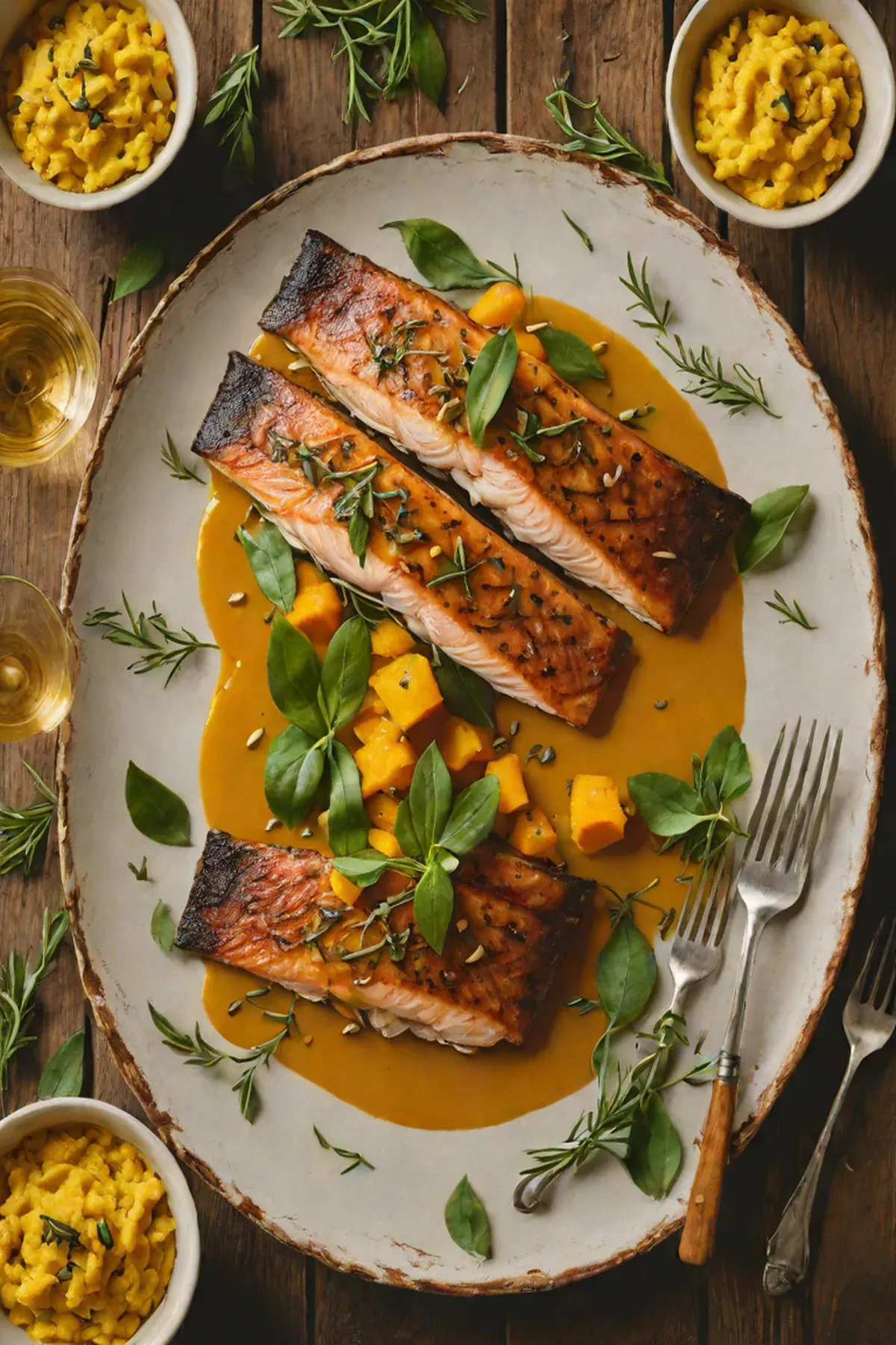 Drizzle the sage brown butter generously over the trout and pumpkin puree. Garnish with crispy sage leaves from the butter and serve immediately with lemon wedges.