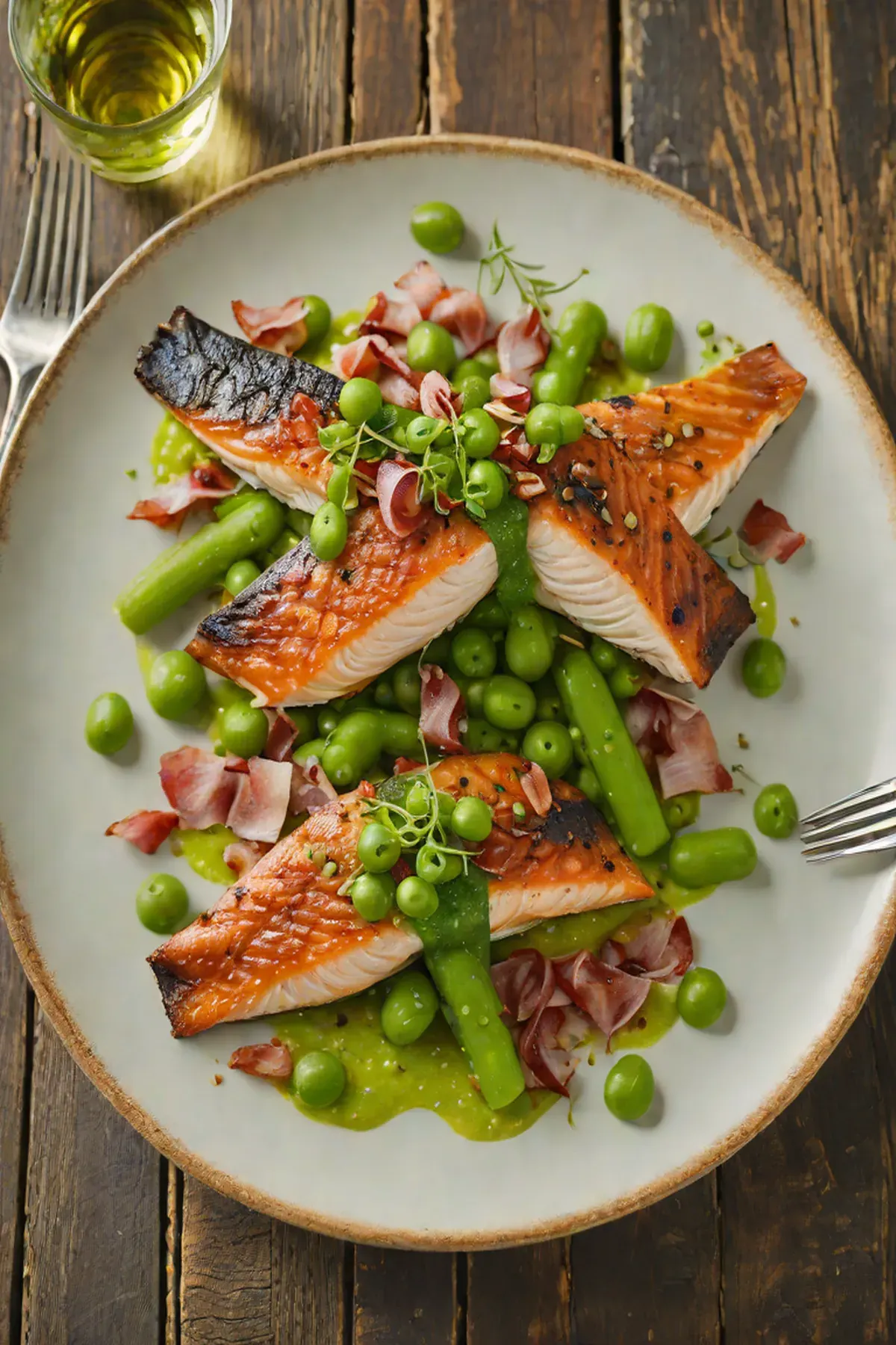 Grilled Trout with Spring Pea Purée and Crispy Pancetta