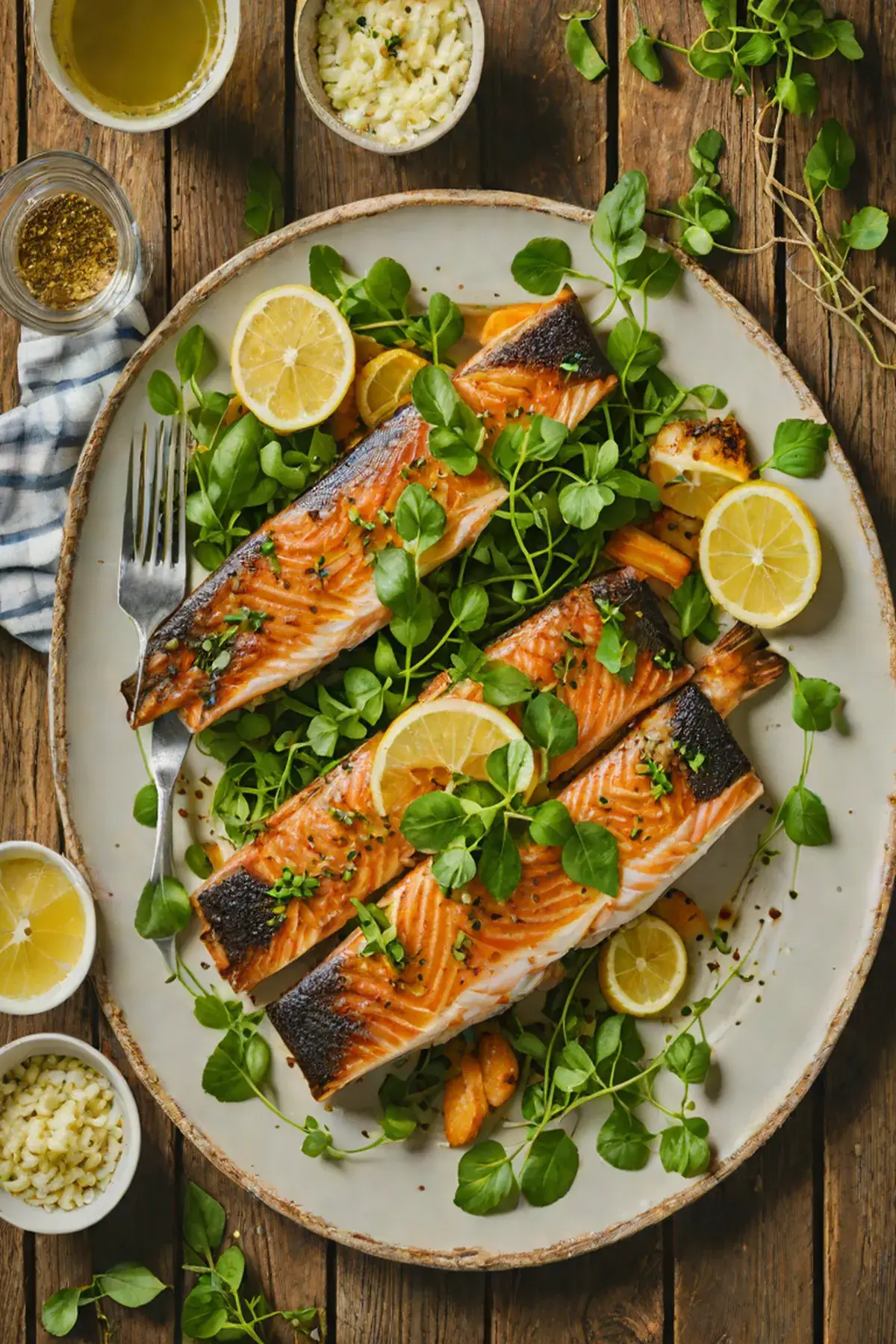 Toss the fresh watercress with half of the lemon butter sauce and arrange on serving plates as a base.