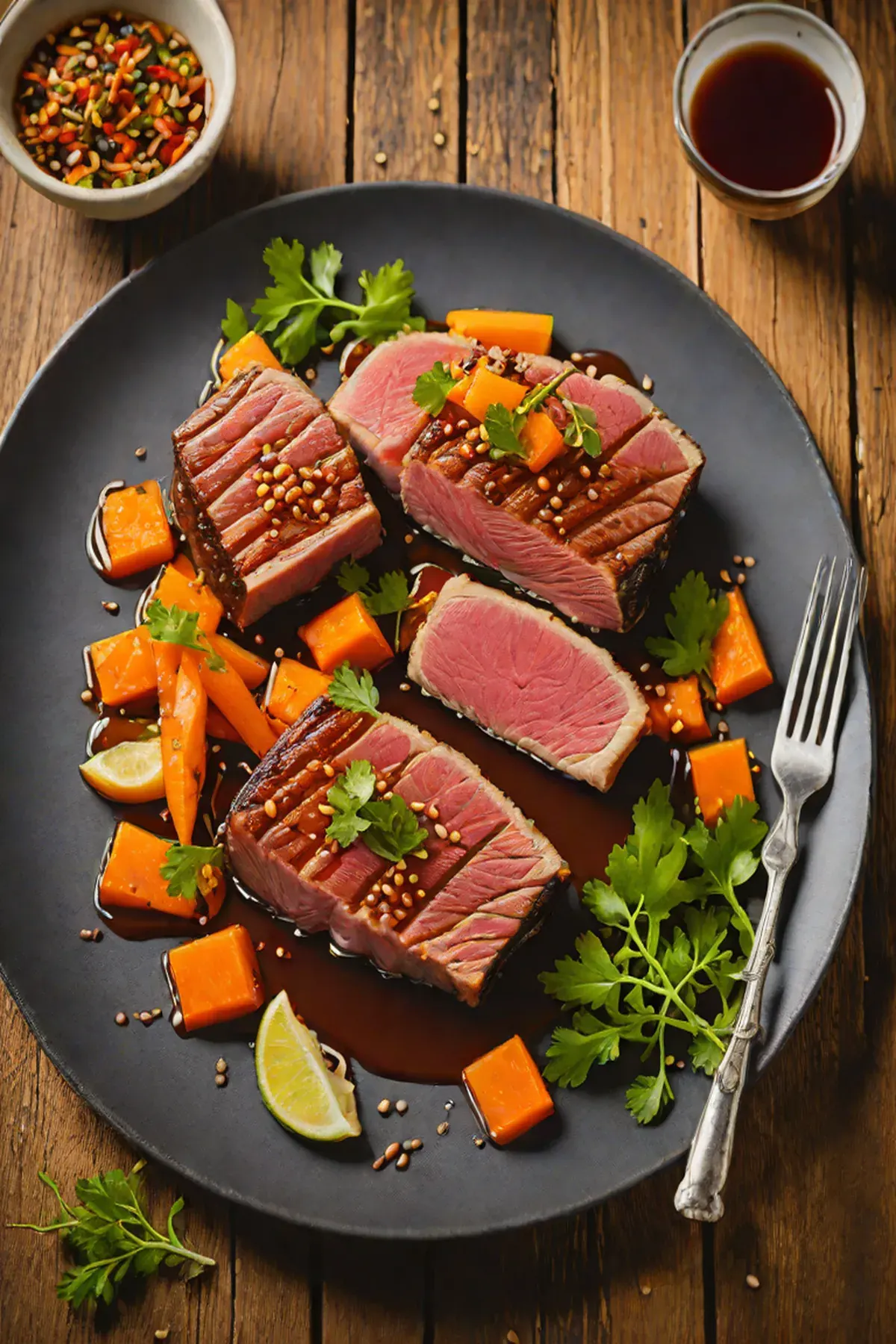 Arrange grilled carrots on serving plates. Place tuna steak or slices alongside the carrots. Drizzle the ginger glaze evenly over the tuna, then finish with a squeeze of fresh lime juice.