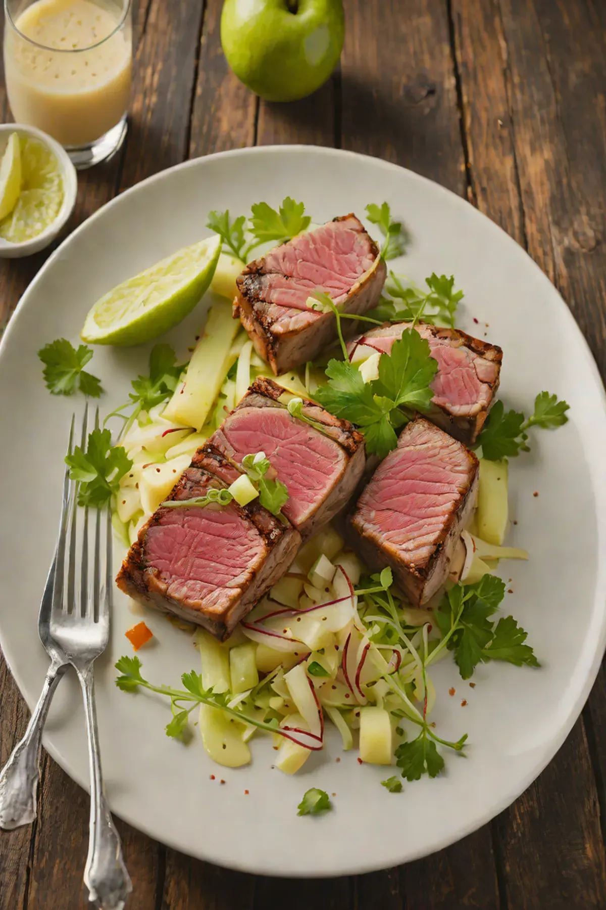 Mound the celery and apple salad on top of or alongside the tuna. Finish with a light sprinkle of fleur de sel and fresh cracked pepper.