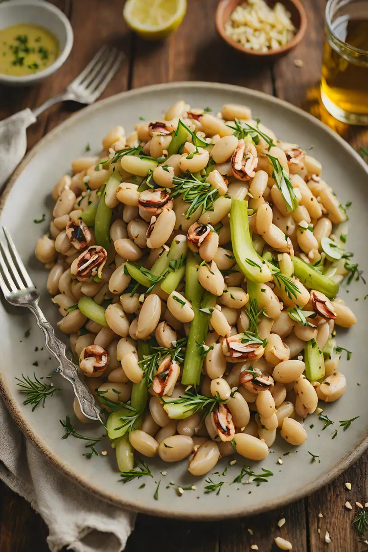In a bowl, combine the beans, sliced leeks, minced garlic, olive oil, salt, and pepper.
