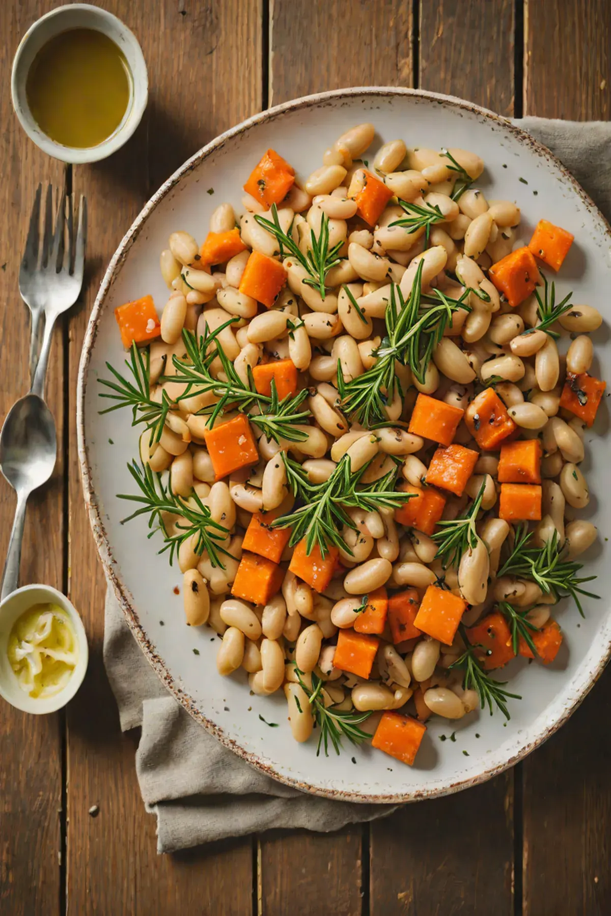 In a large bowl, combine white beans, sweet potato, olive oil, garlic, rosemary, salt, black pepper, and red pepper flakes. Mix well.