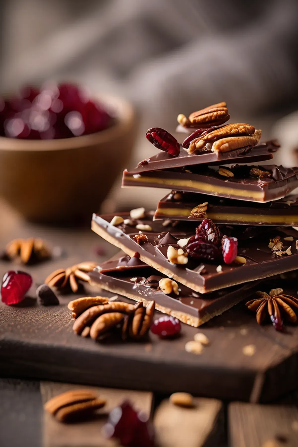 Sprinkle the dried cranberries, chopped pecans, and sea salt evenly over the chocolate layer.