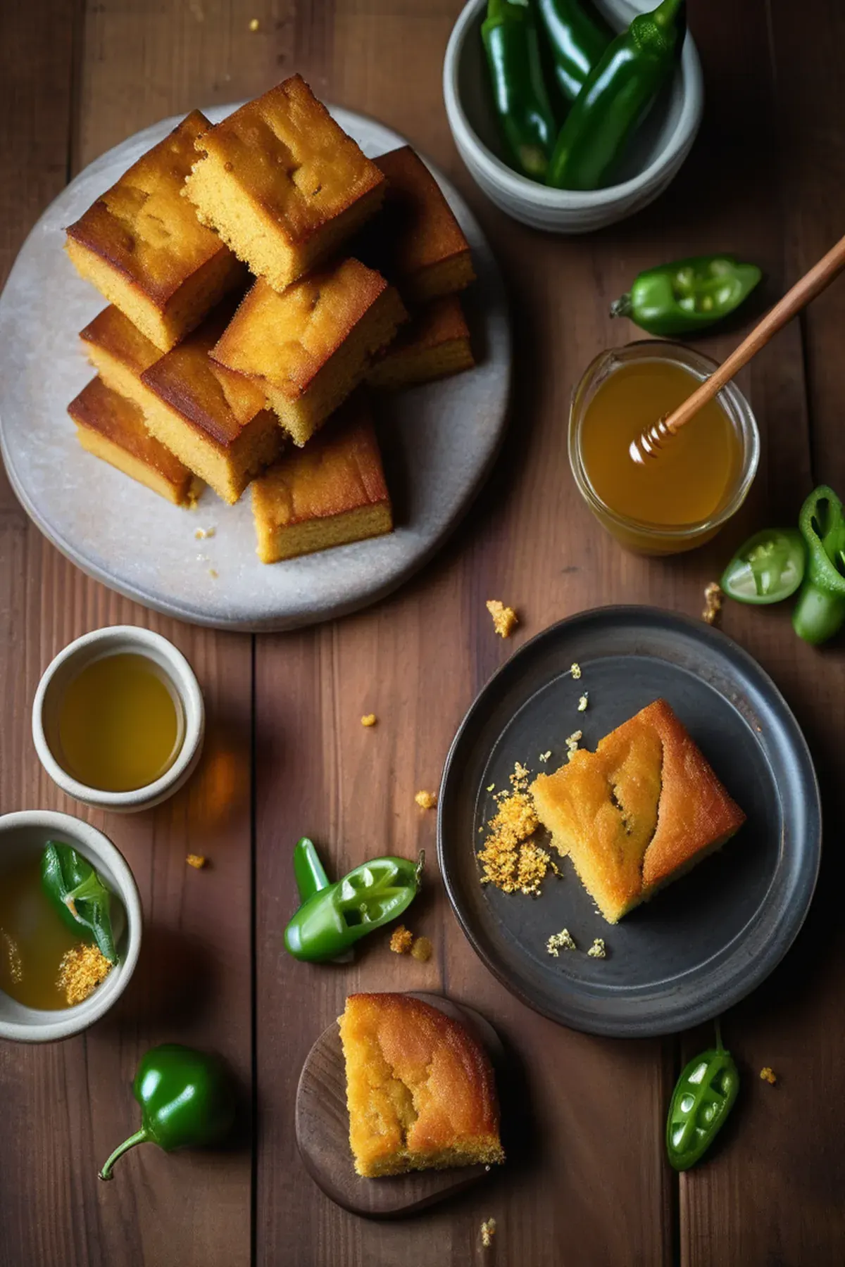 A moist and tender cornbread with a subtle heat from jalapeños and natural sweetness from honey, perfect as a side dish or enjoyed warm with butter.