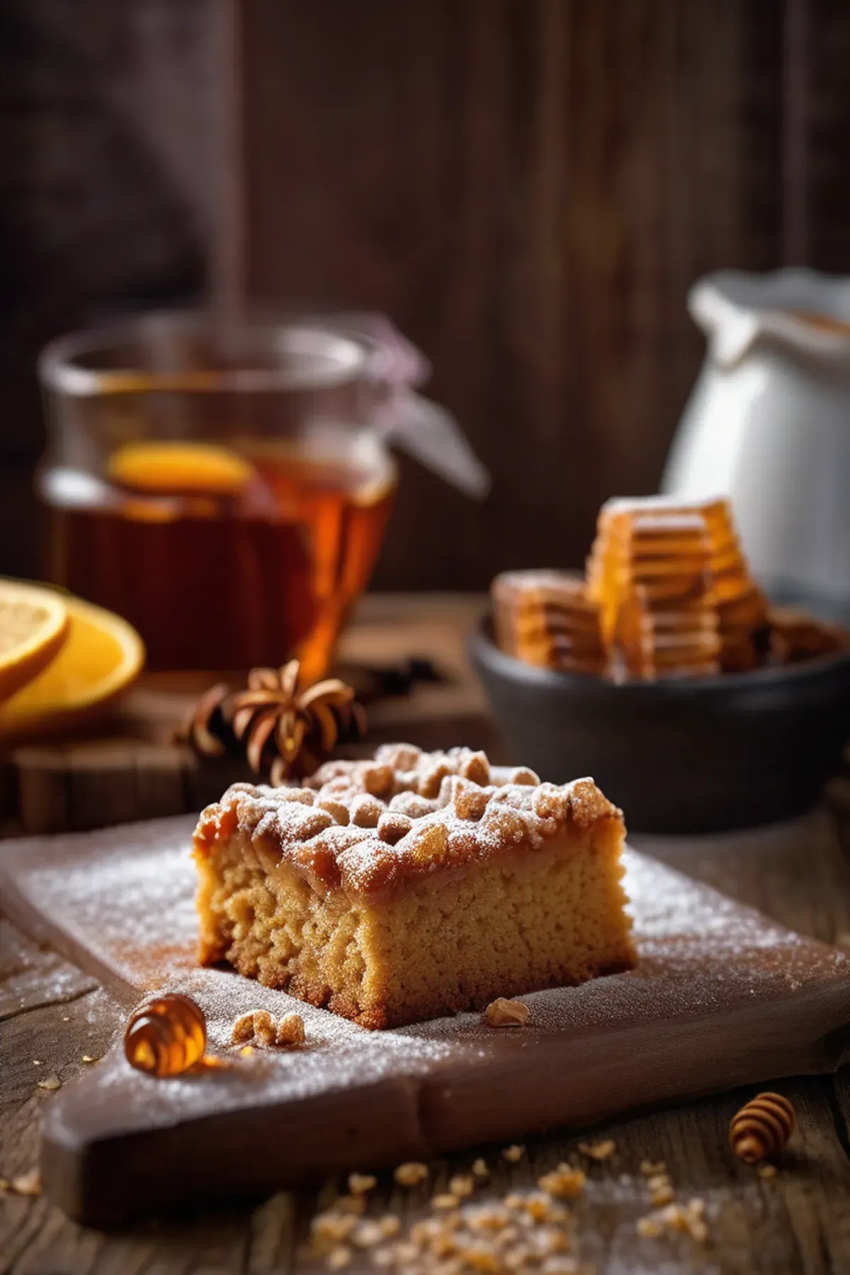 A moist and sweet cake made with honey, perfect for a snack or dessert.