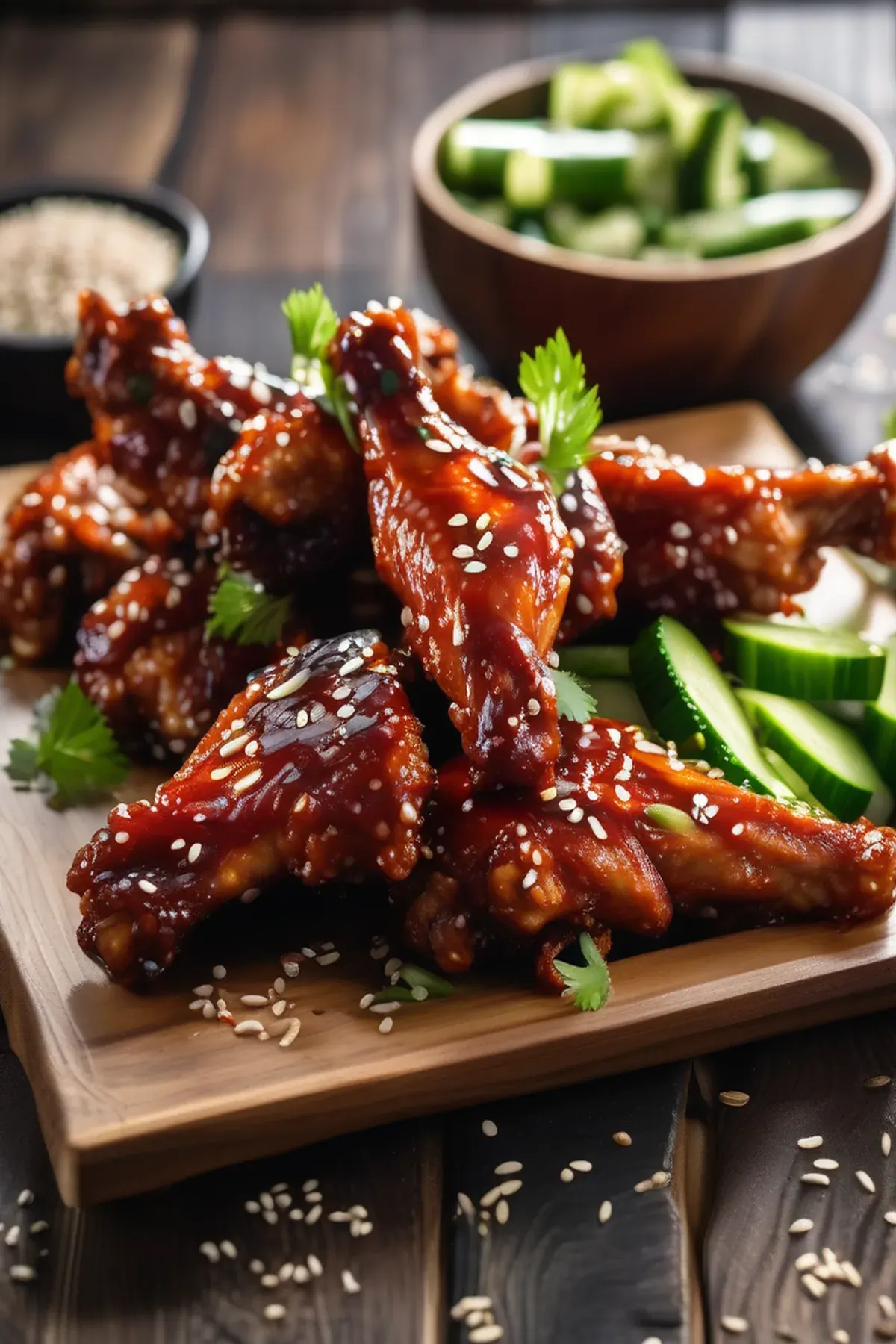 Hot honey gochujang & sesame chicken wings with smashed cucumbers
