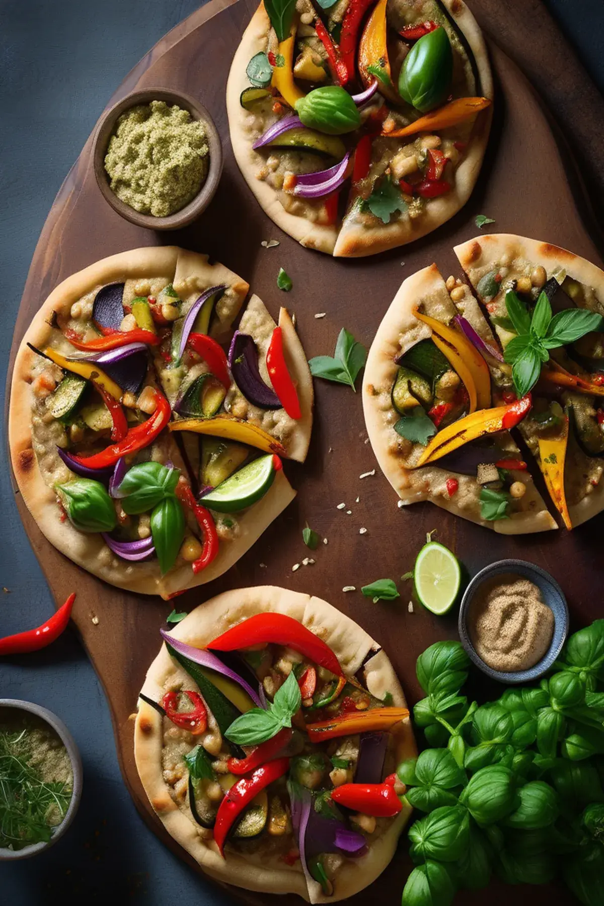 Hummus flatbread pizzas with roasted veg