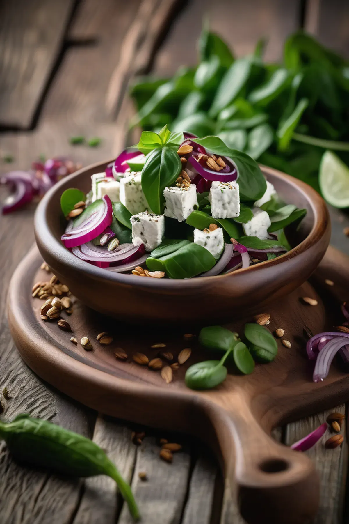 A refreshing mix of crispy tempeh, crunchy veggies, and tangy dressing, perfect for a light lunch or snack.