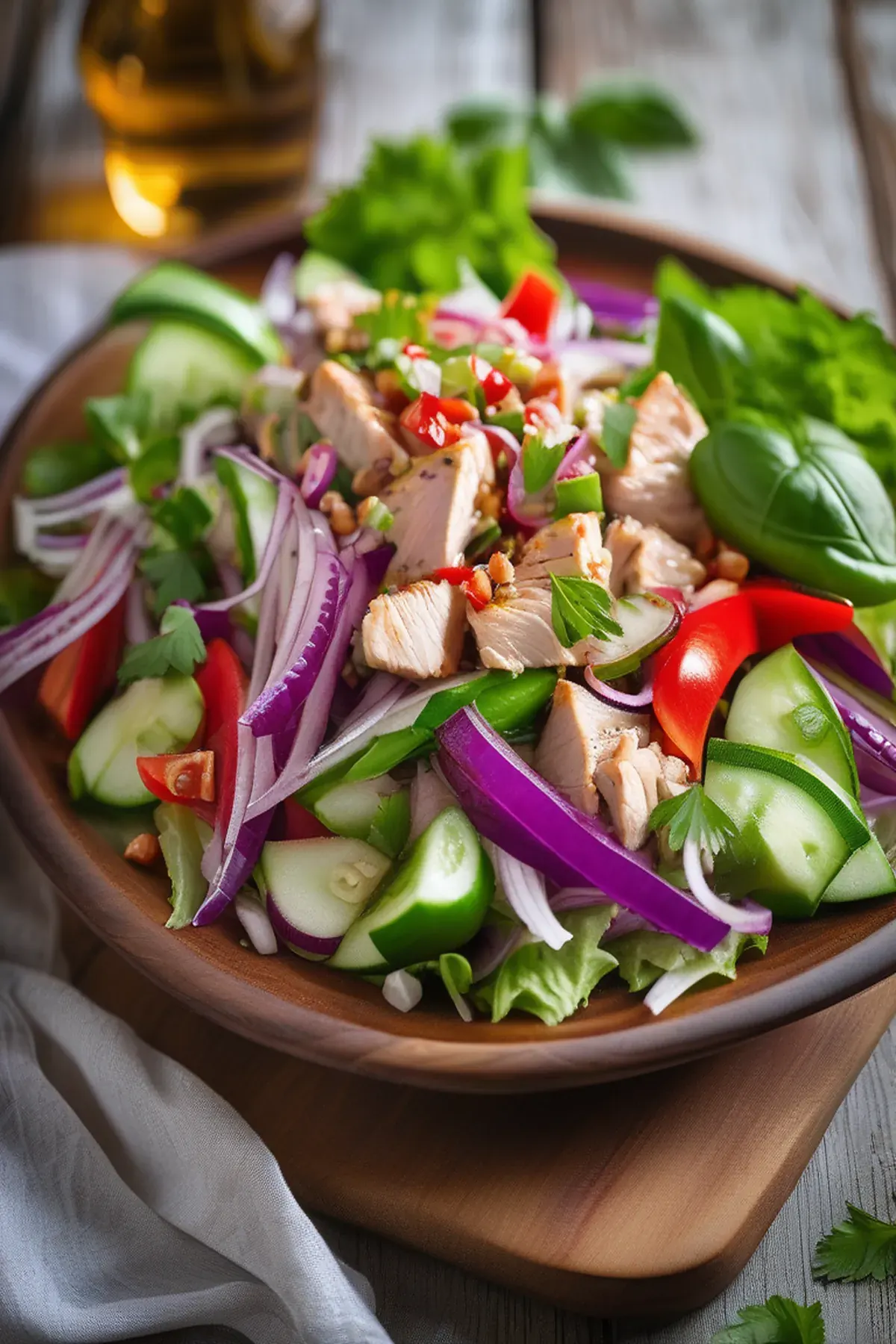 A delicious and refreshing salad made with grilled chicken, vegetables, and Italian dressing.
