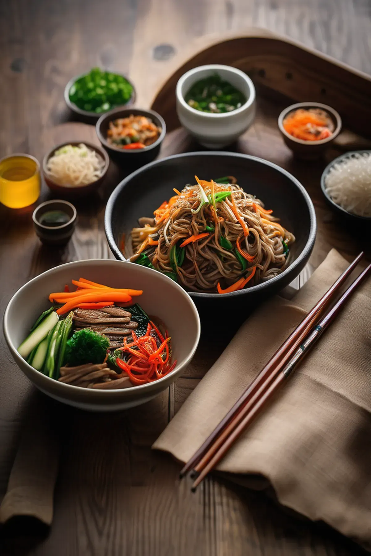 Cook the noodles following pack instructions, then drain and rinse under cold water. Mix the ingredients for the japchae sauce together and set aside.