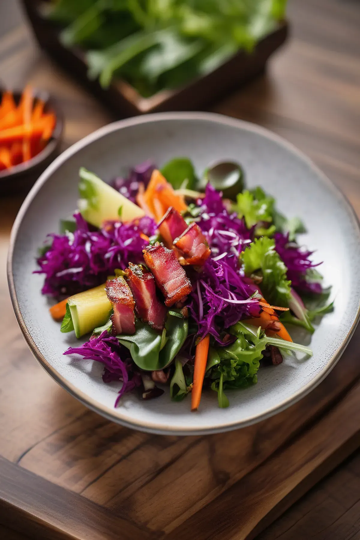 A crunchy, sweet, and savory salad made with crispy Korean bacon, mixed greens, and a tangy Gochujang dressing.