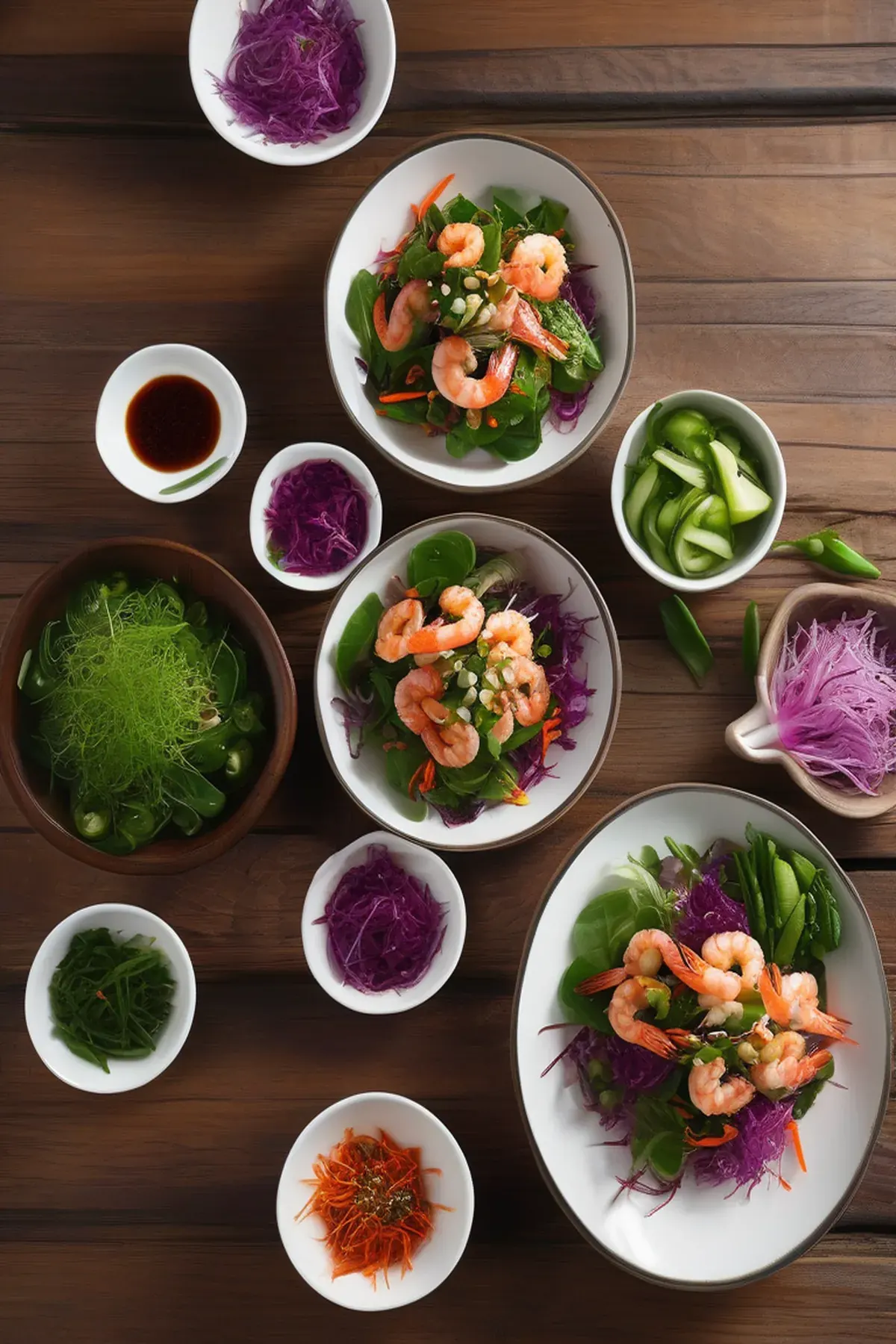 A refreshing and spicy salad featuring succulent prawns, crunchy vegetables, and a zesty Korean-inspired dressing.