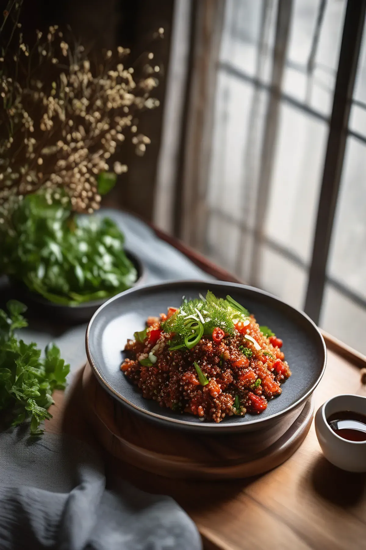 A refreshing and flavorful salad with quinoa, roasted vegetables, and a tangy Korean-inspired dressing.