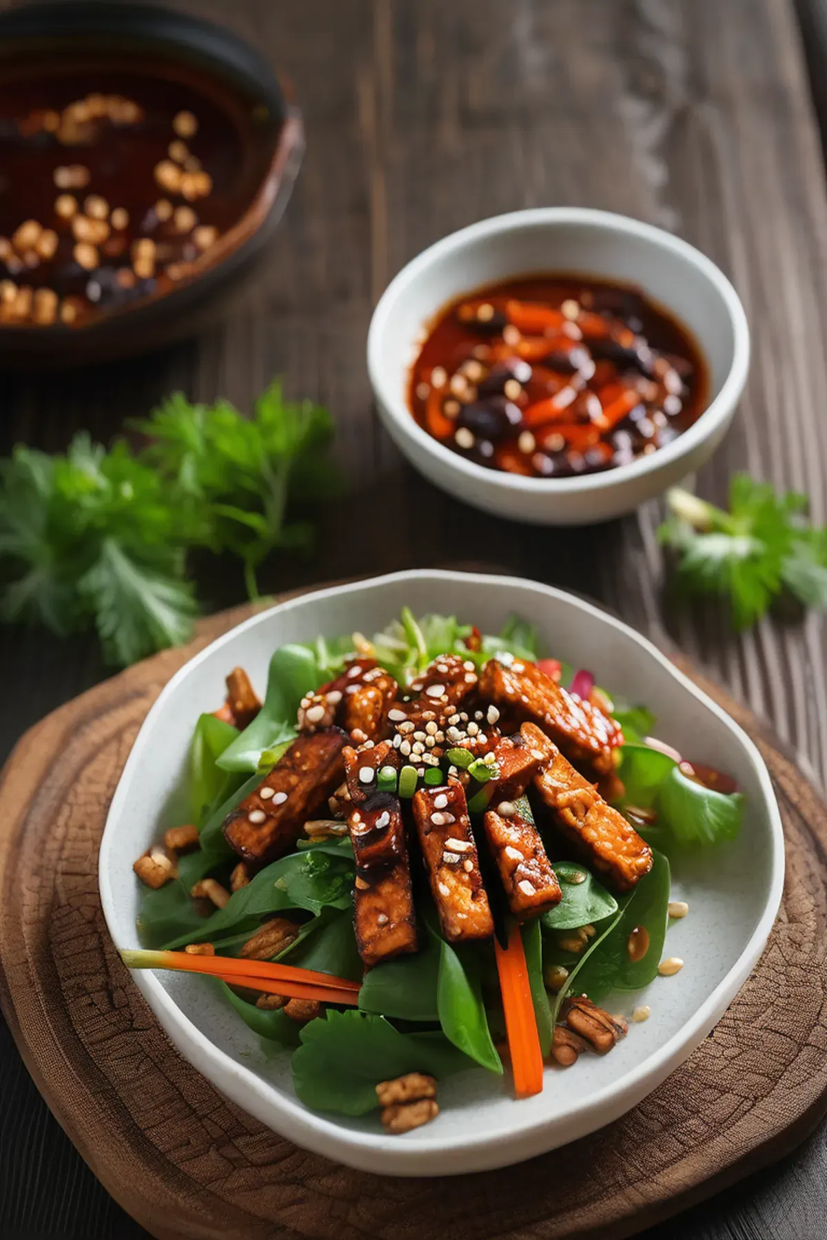 A refreshing mix of crispy tempeh, crunchy veggies, and tangy dressing, perfect for a light lunch or snack.