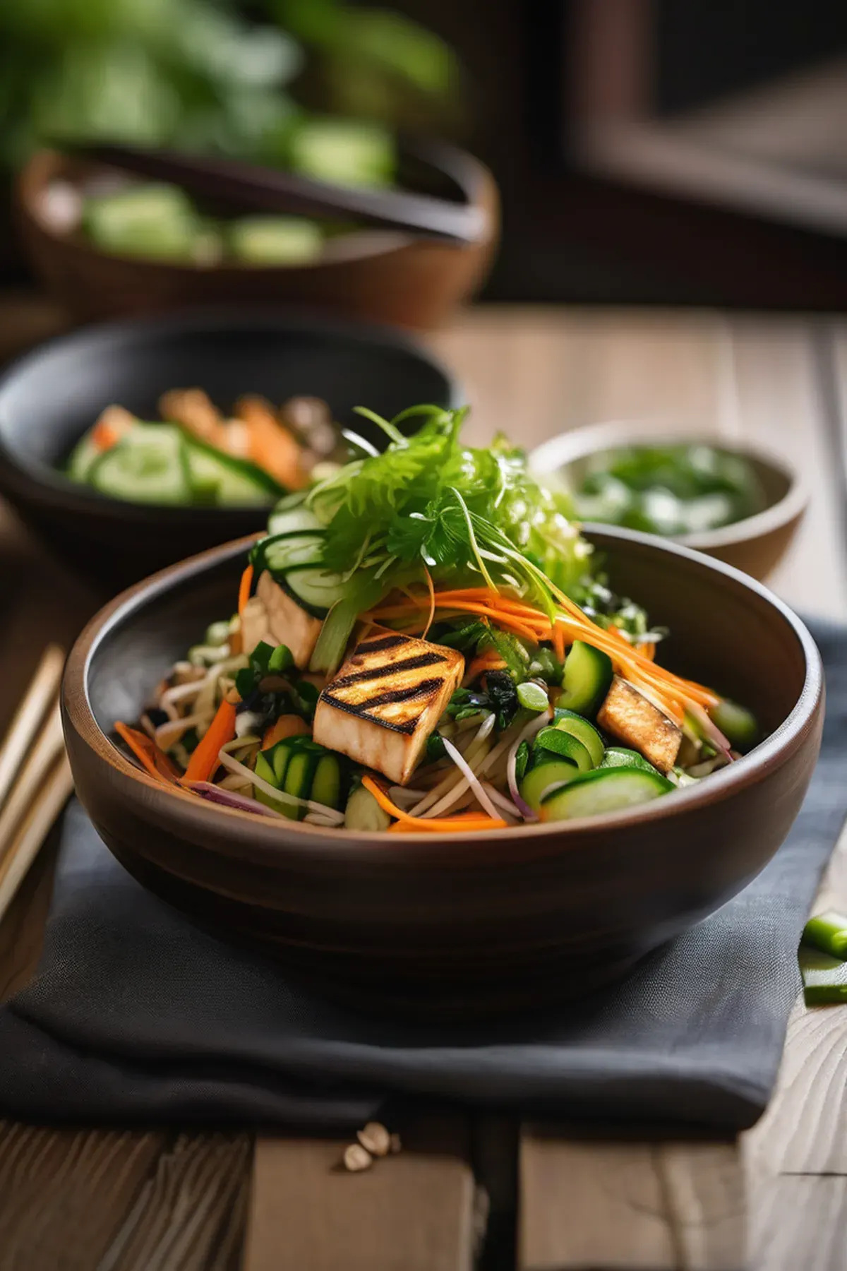 A refreshing and tangy salad featuring crispy tofu, crunchy vegetables, and a zesty Korean-inspired dressing.