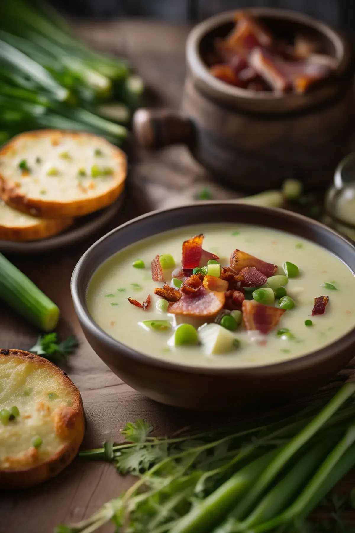 A creamy, comforting chowder loaded with tender leeks and potatoes, finished with a touch of thyme and crispy bacon for depth. Perfect for warming up on cool evenings.