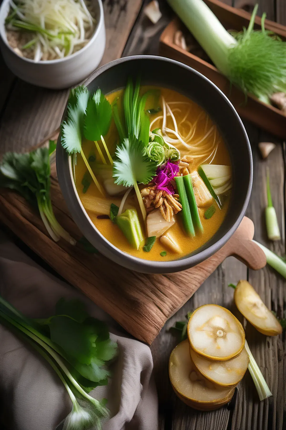 A velvety, aromatic Southeast Asian curry soup featuring tender leeks and creamy potatoes in a fragrant coconut-based broth infused with lemongrass, galangal, and turmeric for a warming, satisfying meal.
