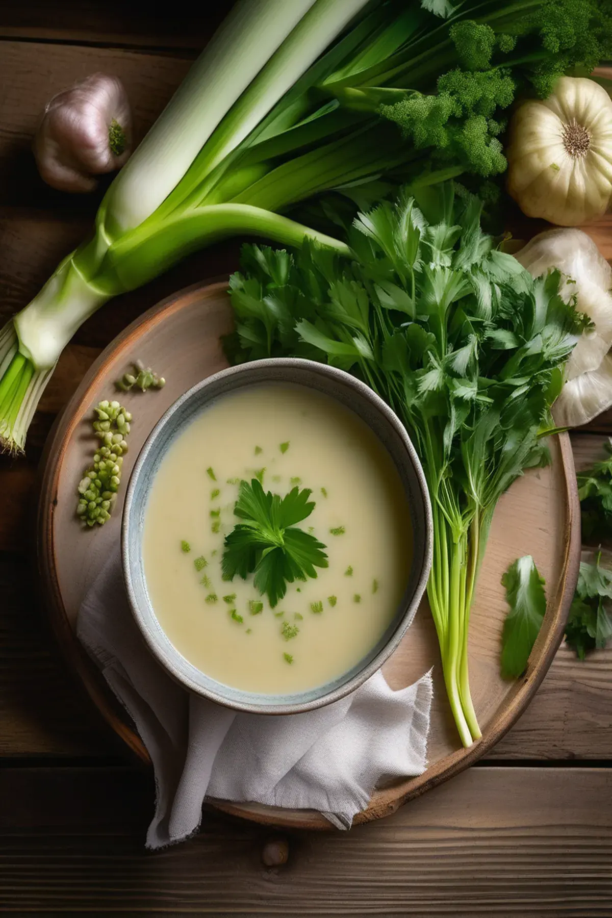 A silky, comforting French-inspired soup that combines tender leeks and creamy potatoes into a velvety potage, finished with a hint of thyme and fresh cream for elegance.