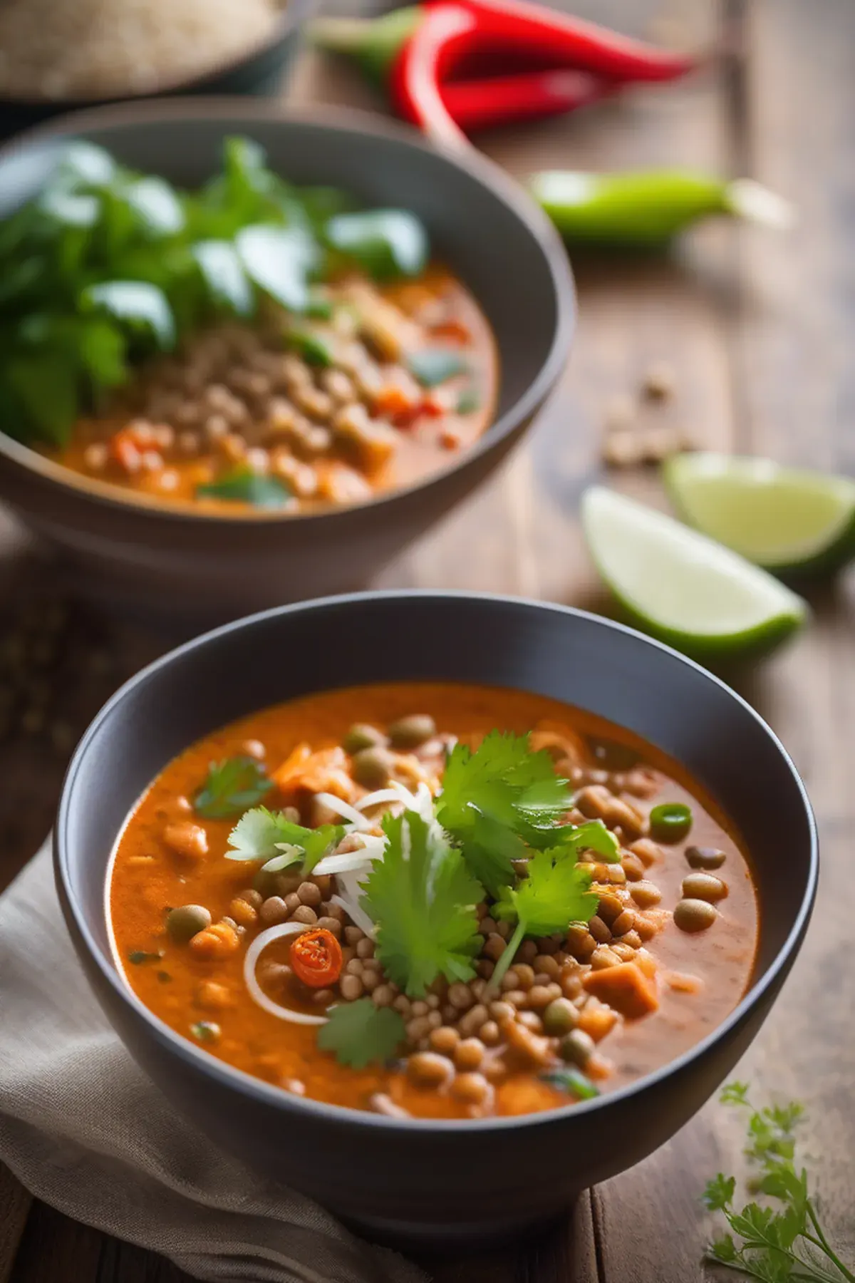 A creamy, aromatic Southeast Asian soup bursting with warm spices and tender lentils, served with crispy accompaniments for textural contrast.