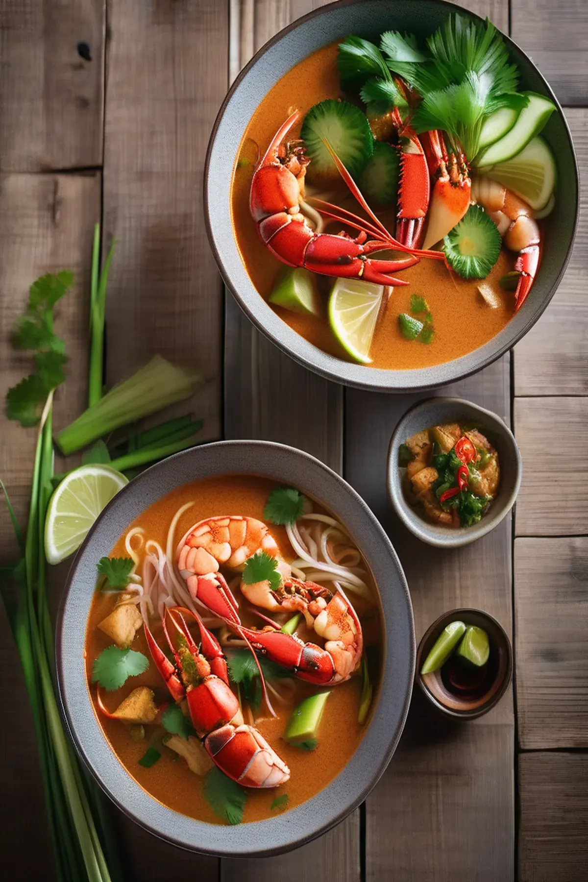 Indulge in a rich, flavorful, and spicy laksa dish packed with chunks of succulent lobster, soft rice noodles, and a medley of fragrant vegetables.