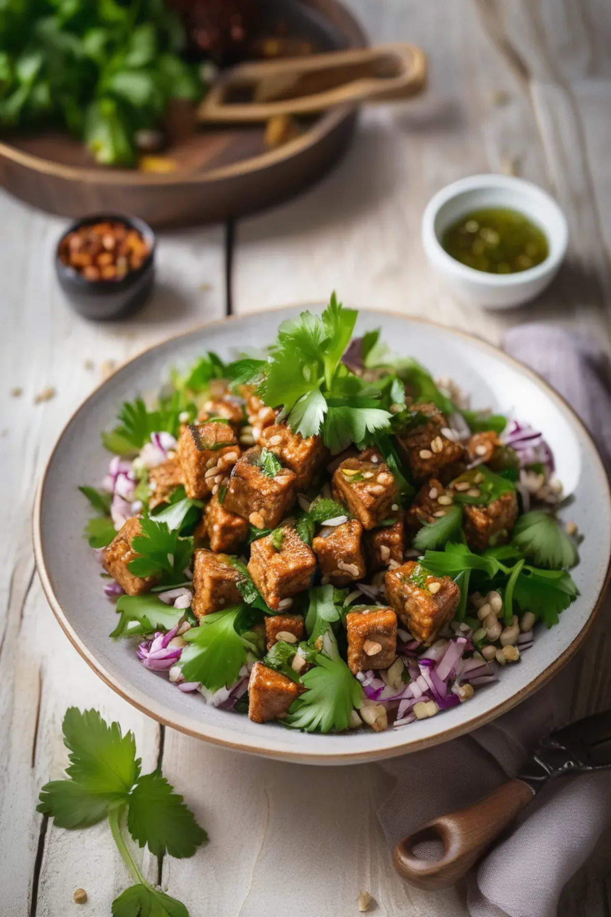A refreshing and healthy salad featuring marinated tempeh, crunchy vegetables, and tangy feta cheese.
