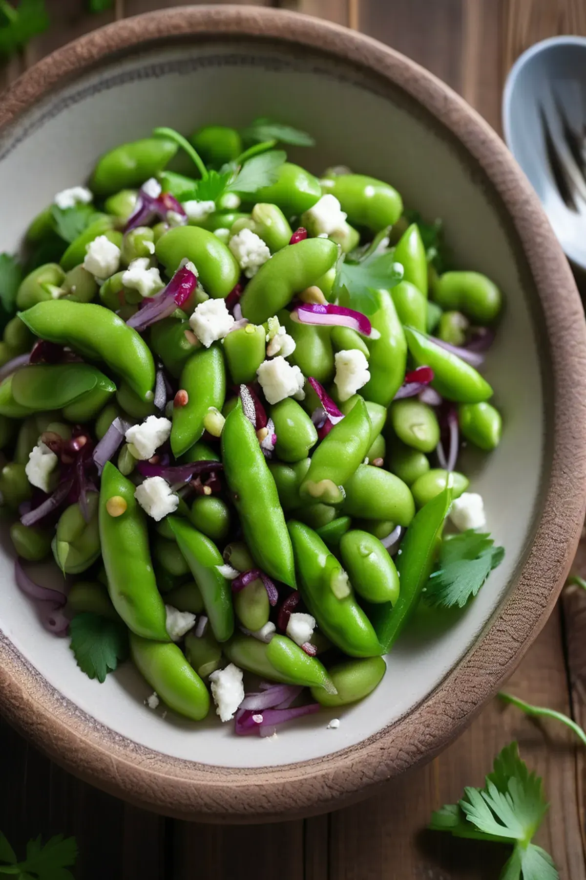 A refreshing and flavorful salad originating from the Middle East, made with boiled edamame, crunchy cucumber, and tangy feta cheese.