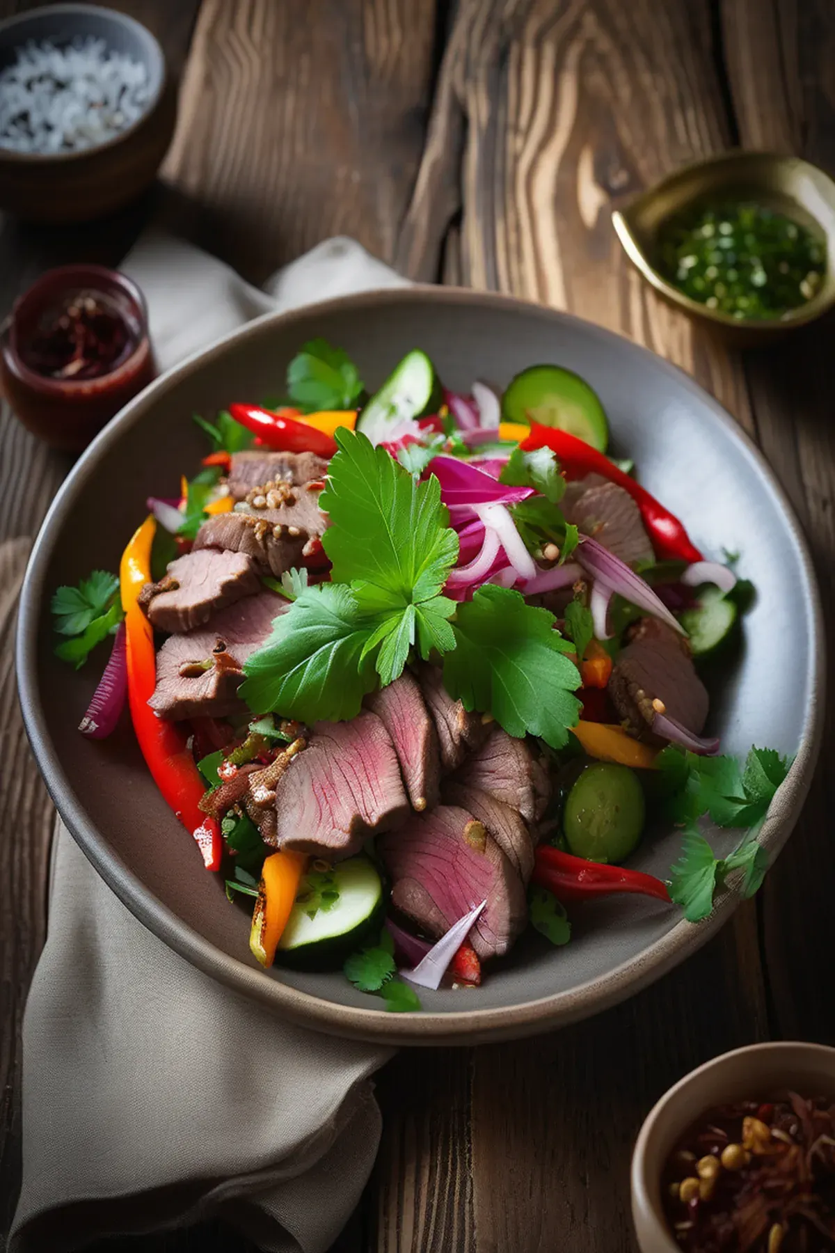 A refreshing salad with the flavors of the Middle East, featuring tender lamb, crunchy vegetables, and a tangy tahini dressing.