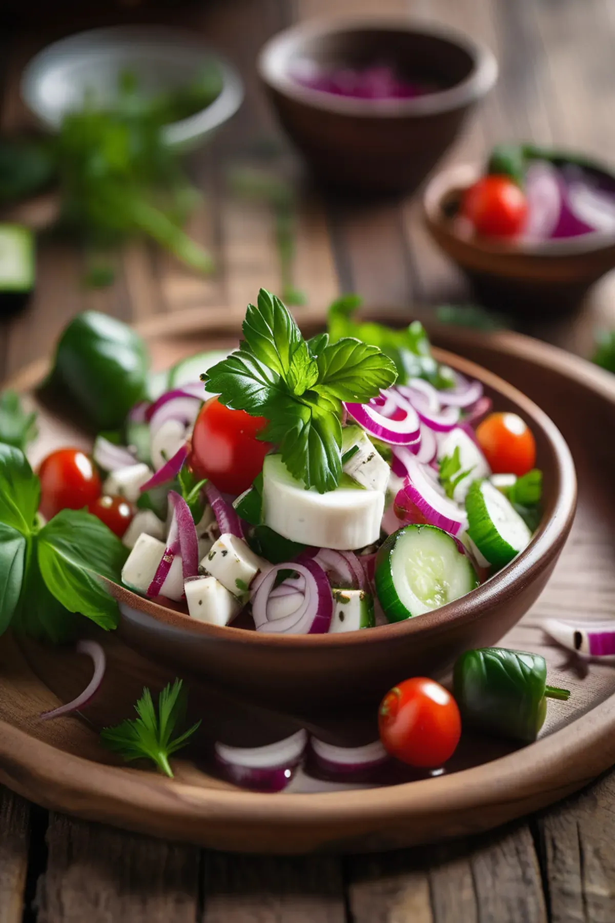 A refreshing salad inspired by the flavors of the Middle East, combining creamy mozzarella with crunchy vegetables and tangy dressing.