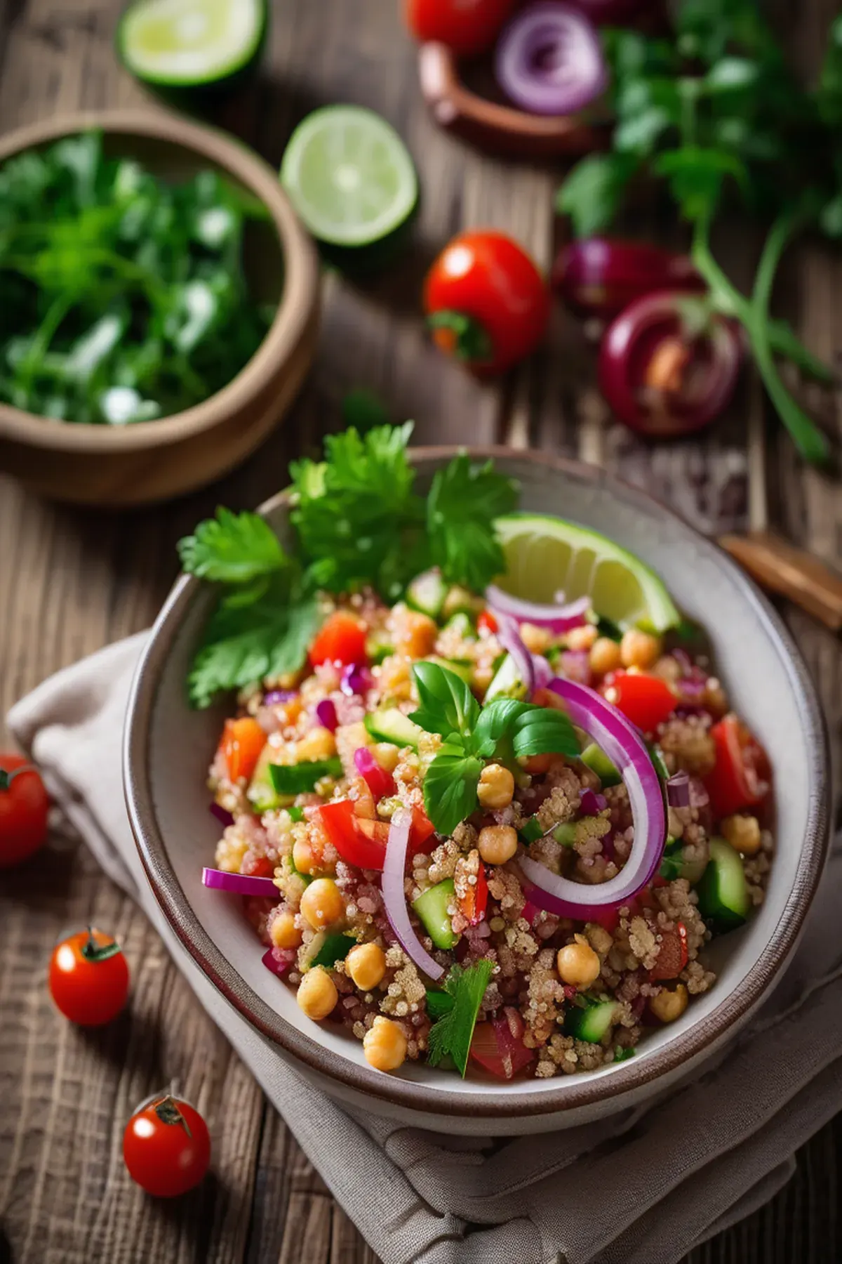 In a large bowl, combine the cooked quinoa, chickpeas, cucumber, tomato, and red onion.