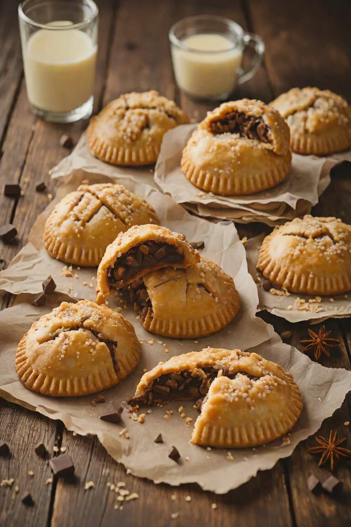 Place a small spoonful of milk chocolate chips in the center of each dough circle. Fold the dough over the filling to form a half-moon shape and press the edges together to seal the pie.
