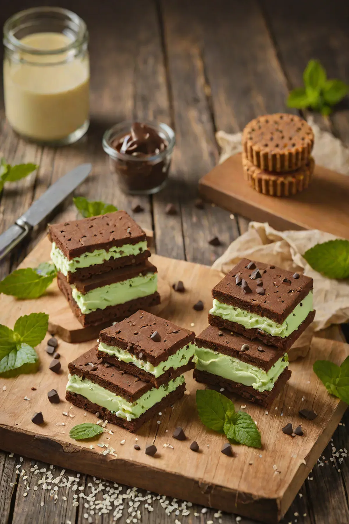 Place a scoop of mint chocolate ice cream between two chocolate cookies.