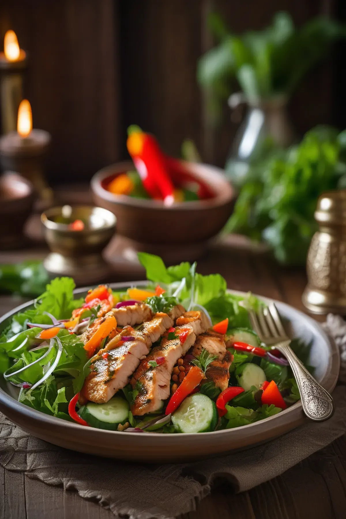 A refreshing and flavorful salad featuring tender chicken, crunchy vegetables, and aromatic spices.