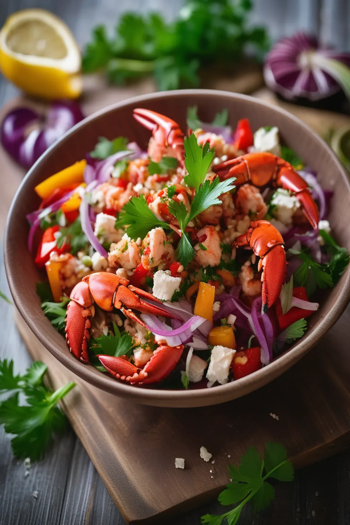 In a large bowl, combine the lobster meat, red onion, bell pepper, feta cheese, parsley, and pomegranate seeds.