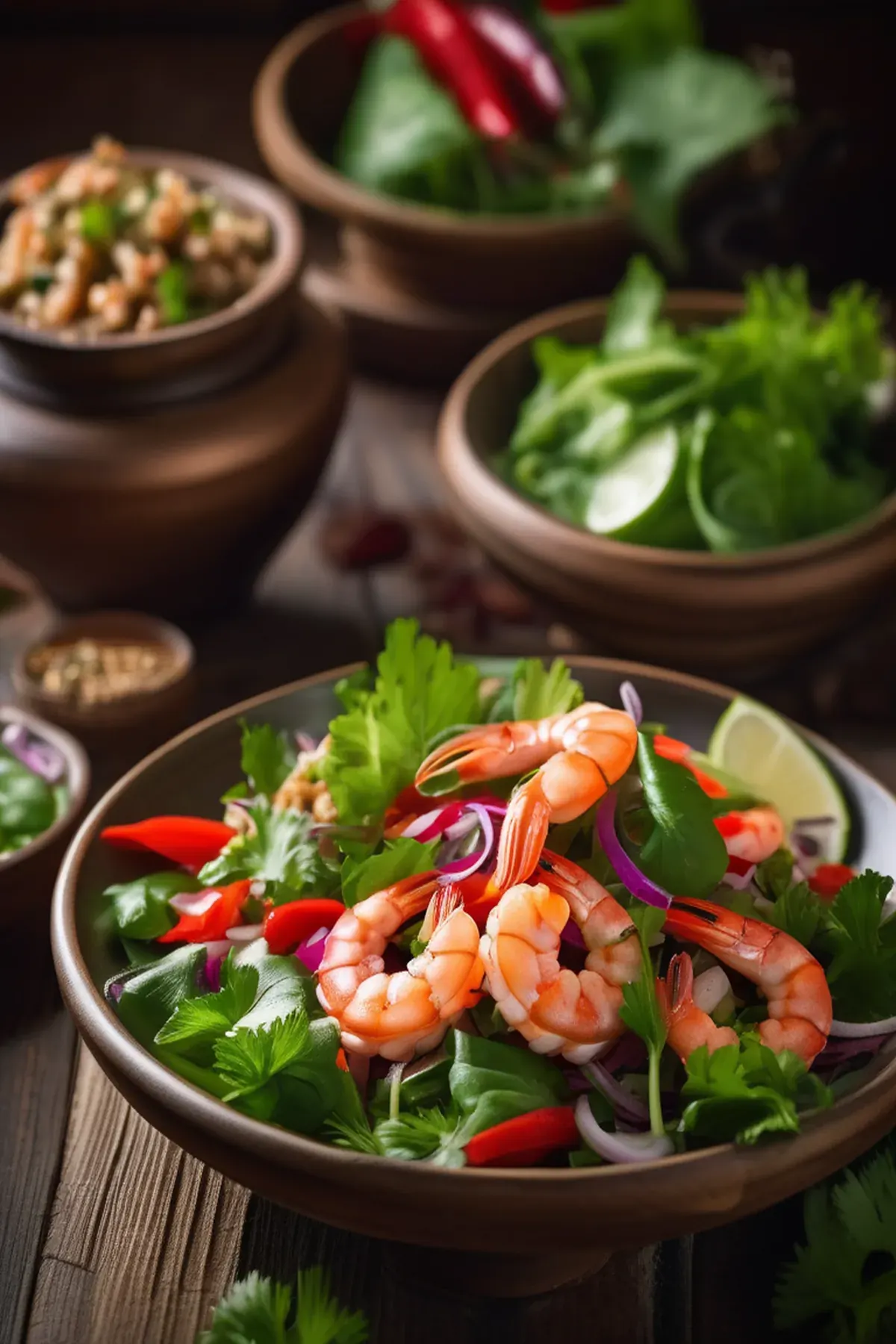 A vibrant and flavorful salad from the Mediterranean coast, featuring succulent prawns, crunchy vegetables, and tangy Moroccan spices.