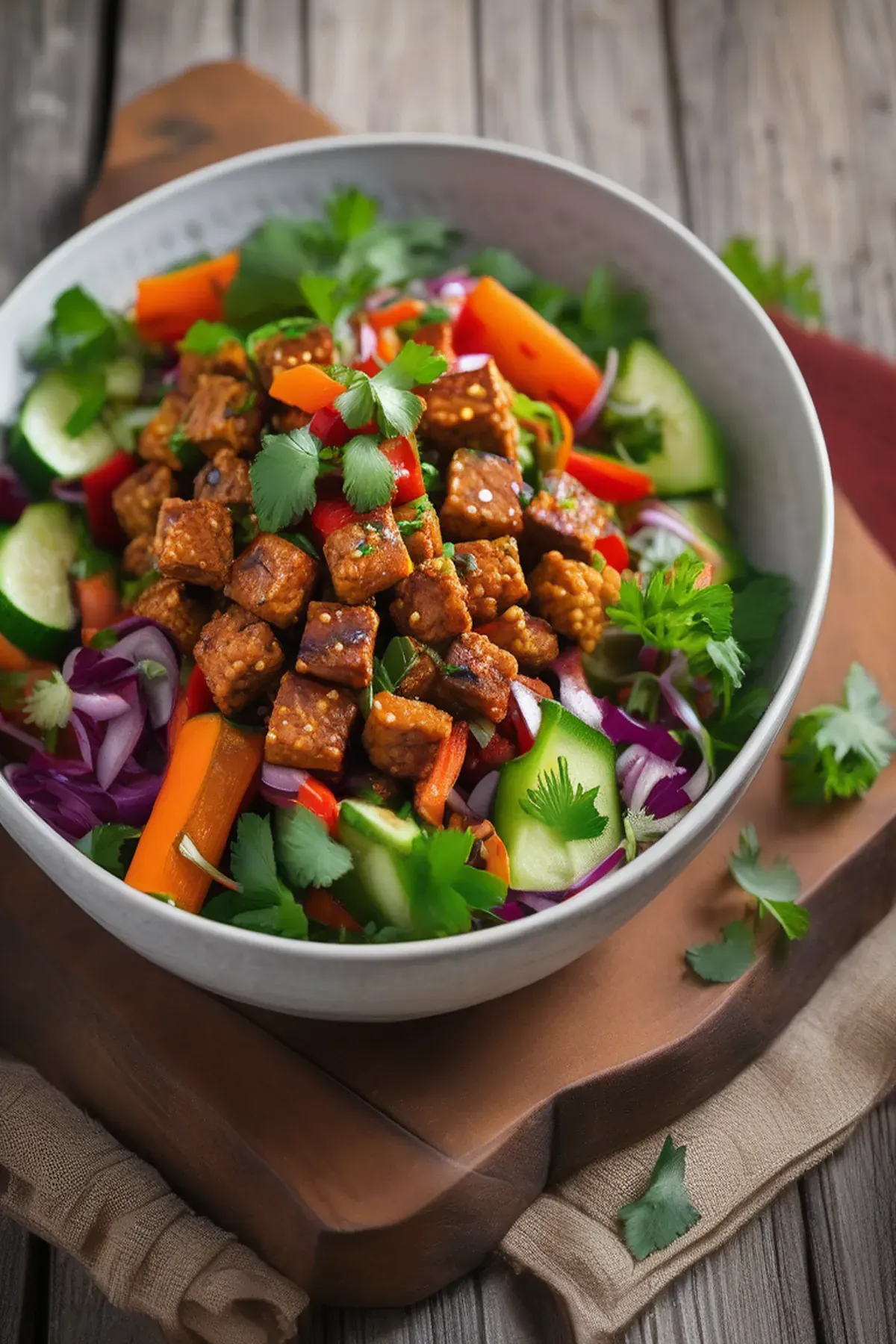 A flavorful and refreshing salad featuring crispy tempeh, crunchy vegetables, and a zesty Moroccan-inspired dressing.