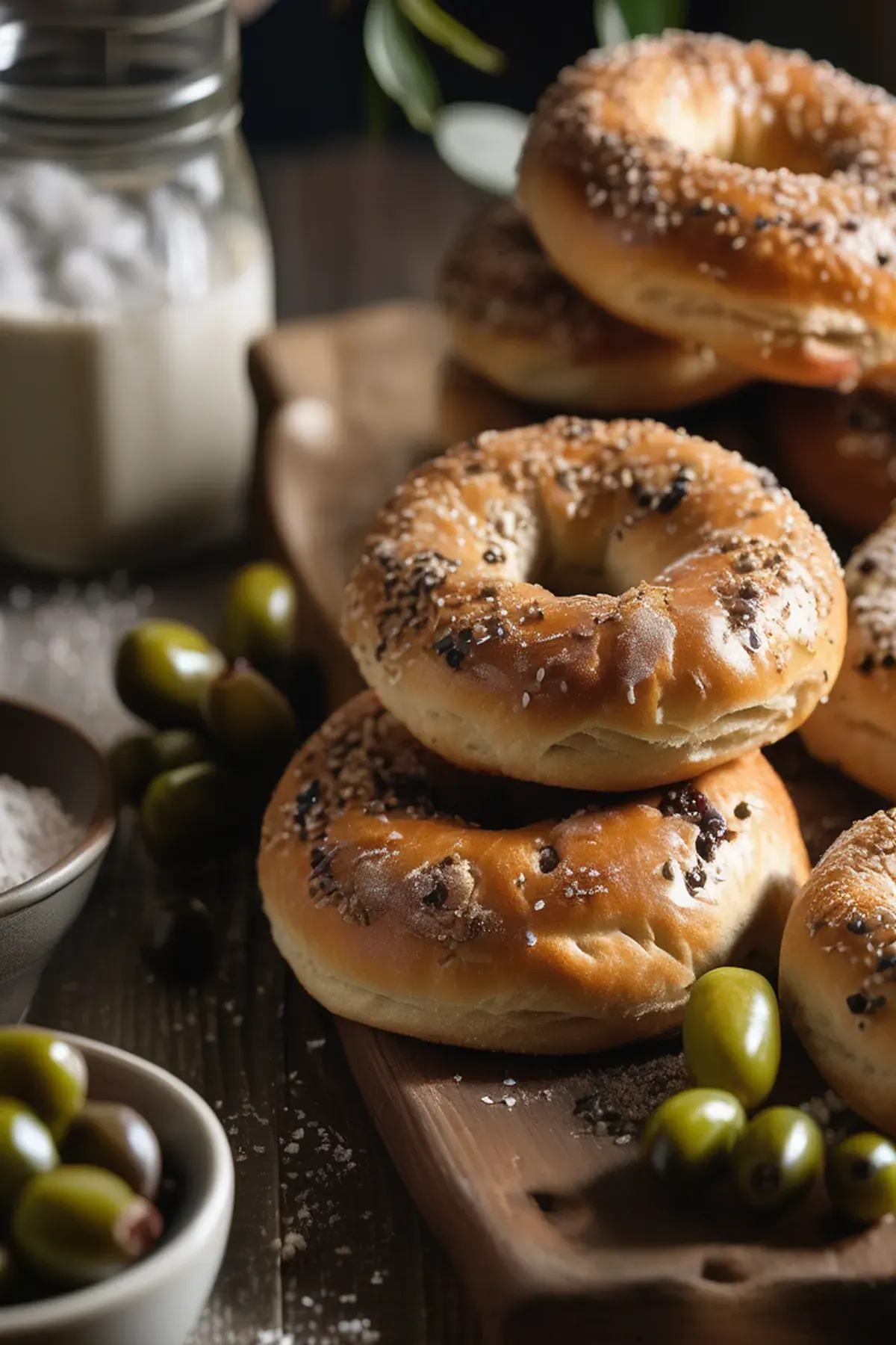Savory bagels studded with briny kalamata olives and herbs, perfect for breakfast or lunch with cream cheese and fresh vegetables.