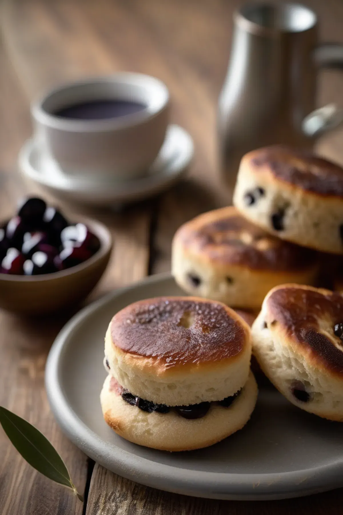Savory English muffins studded with briny kalamata olives and herbs, perfect for toasting and serving with cream cheese or your favorite spreads.