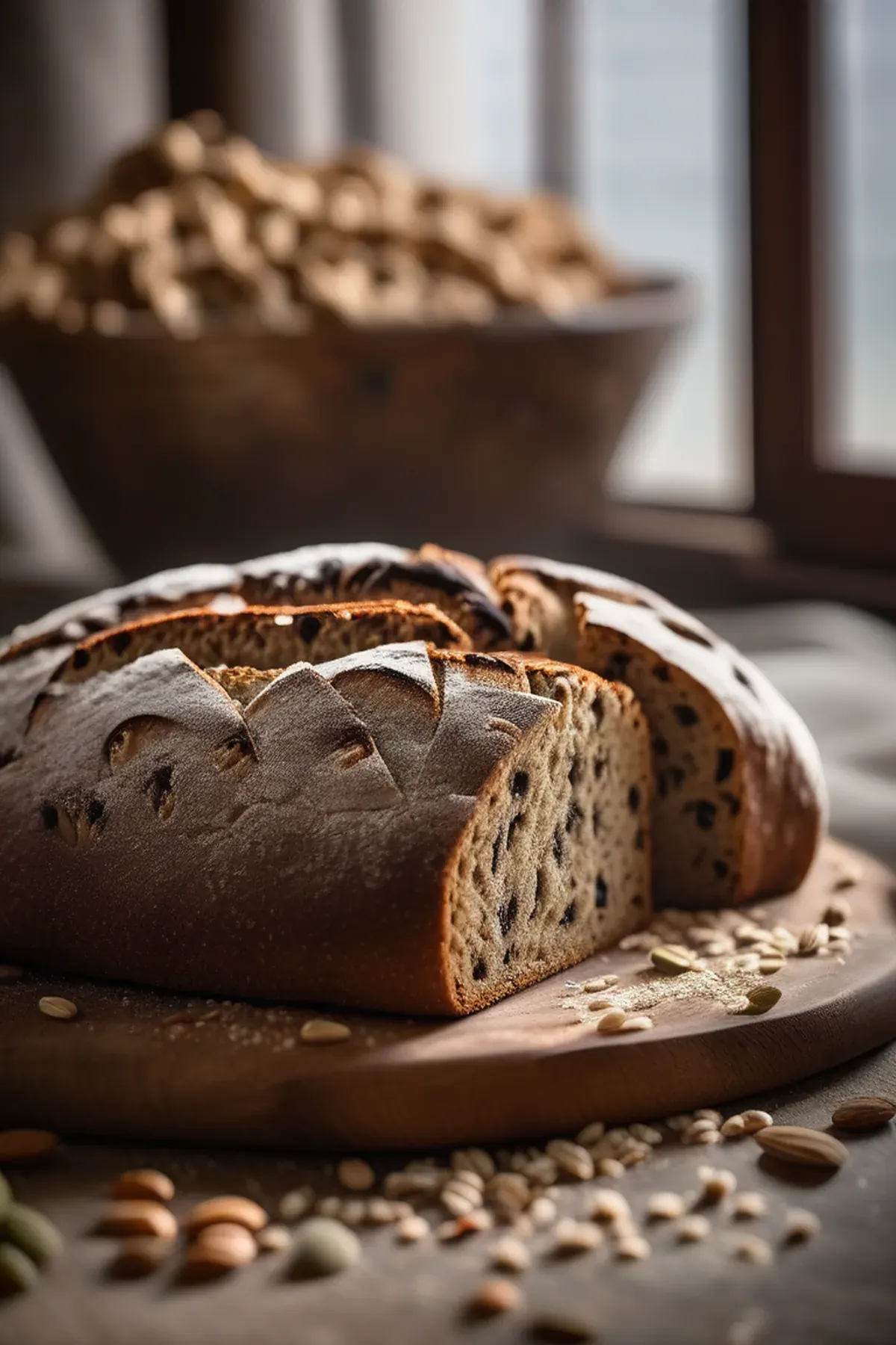 A hearty, rustic rye bread studded with briny green olives and aromatic herbs, perfect for toasting or serving alongside soups and stews.